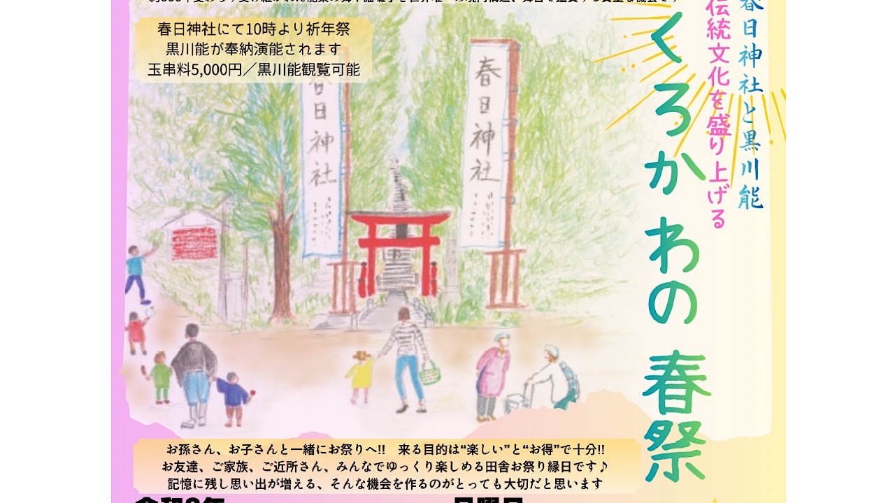 令和8年3月23日、春日神社にて執り行われる祈年祭にあわせ、境内にて「くろかわの春祭(縁日)」を開催いたします。