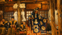 大地踏(だいちふみ) 演目 2026.02.23 能楽とは異なる黒川能独特の演目で、 稚児によって演じられる。 作者は法光院に身を寄せられた法然上人との説や、法光院別当の作との言い伝えがある。大地踏を務める子供は男児と決まっているが、上座と下座では出立が違っていて、上座は男装、 下座は女装となっている。 また、謡と所作も上座下座によって多少異なる。物語性はなく郷土に因んだ祝言的な謡、足拍子を踏んで大地を踏みしめ悪霊を鎮めるなどの所作で、新年の安穏と繁栄を祈るものとされている。