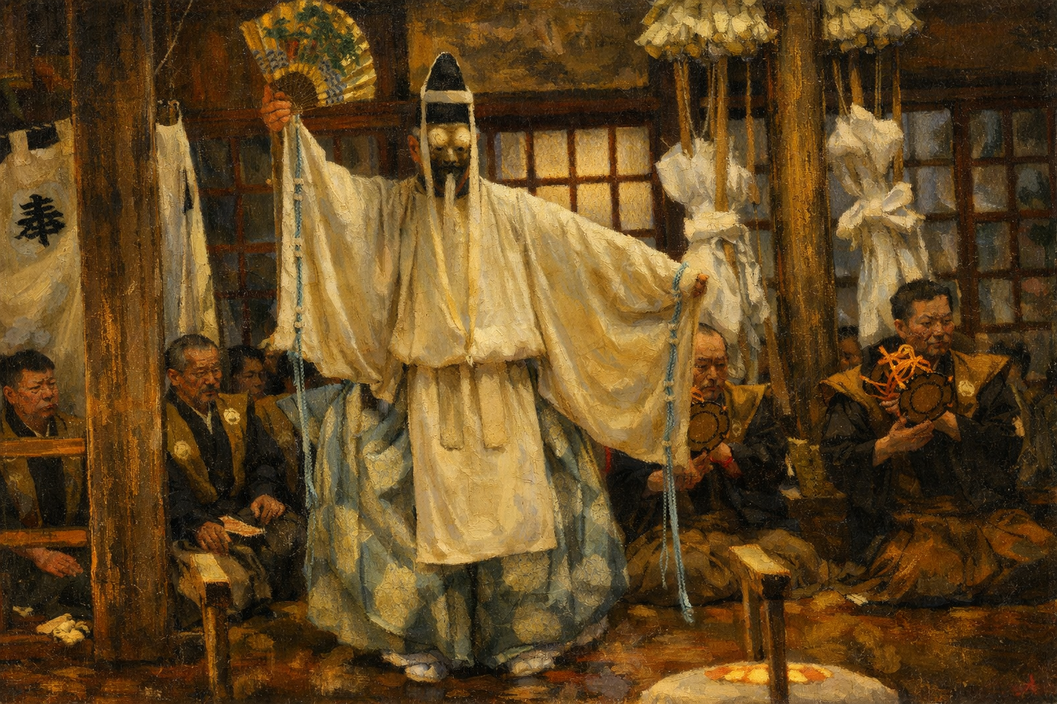 一日の能の最初に勤めて、翁が天下泰平と国土安全を祈念し、且つその演能の場を清めるというもの。三番叟は、さらに五穀成就を寿ぎ、俗に三番を踏むというような足拍子が多く、 これは邪気を踏み鎮める呪法的なものが感じられる。また烏飛びや、種まきなどの型は豊作に因み 間信仰の名残りを思わせるものがある。